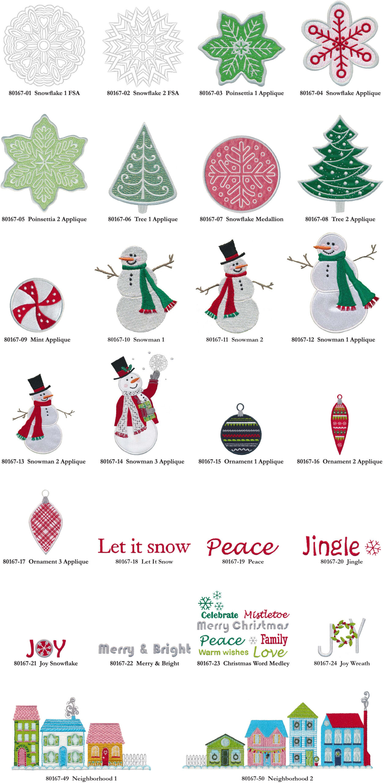 A huge 50 design collection, chock full of Christmas cuteness, with applique ornaments, linework snowflakes, and included project instructions, you’ll be saying “let it snow” so you can stay inside and let it sew! The designs are based on the Let it Snow fabric collection by Cherry for Contempo Studio of Benartex and digitized by OESD.