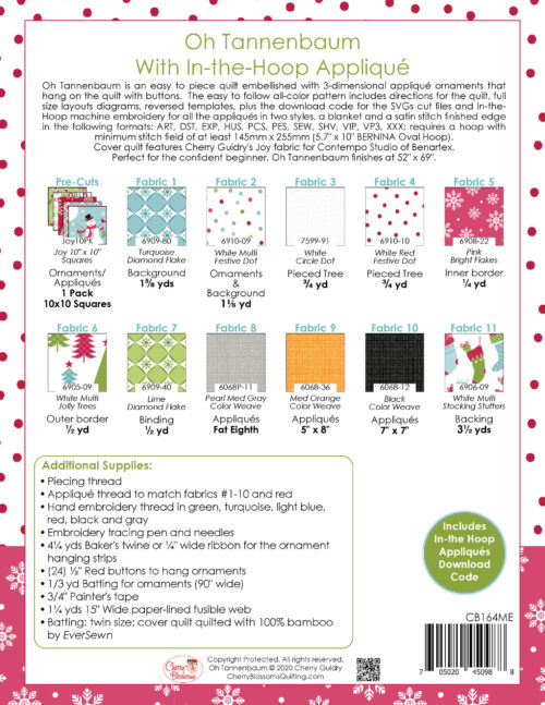 Oh Tannenbaum is an easy to piece quilt embellished with 3-dimensional applique ornaments attached to the quilt with buttons. The all-color pattern includes full size layout diagrams, reversed templates for fusible applique and SVG cut files to cut the applique shapes with your favorite electronic cutter.