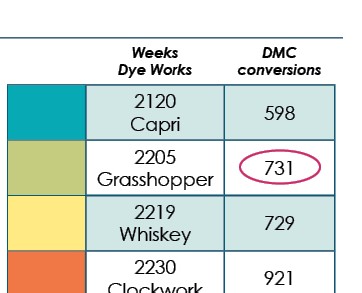 Winter Joy Cross Stitch Chart: WDW 2205 Grasshopper correct DMC conversion is 731, you can also use 3012 which is just a bit lighter.